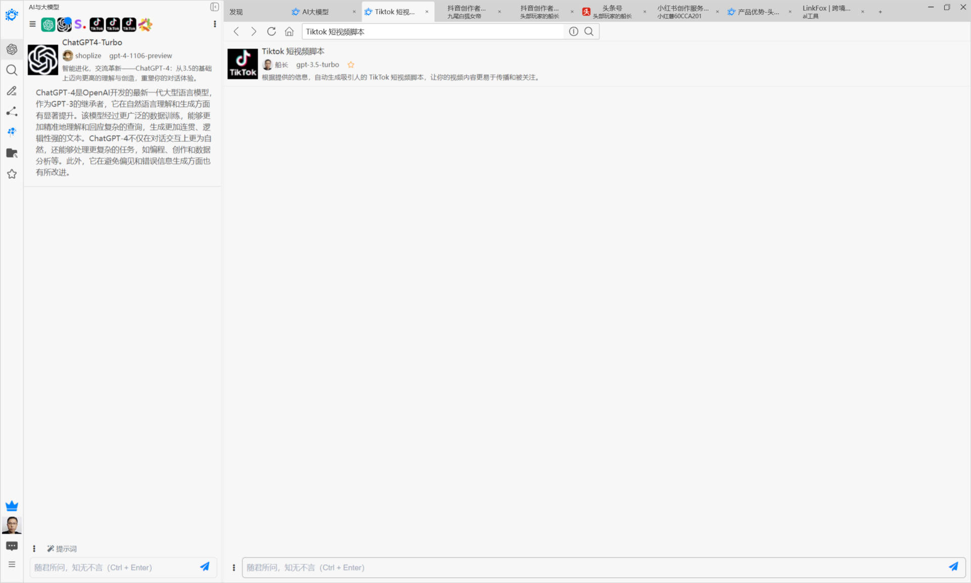 支持ChatGPT,DeepSeek,Gemini等主流大模型,数百种内容创作,电商运营,运营推广领域的智能体随时使用,支持自建大模型,自定义智能体。